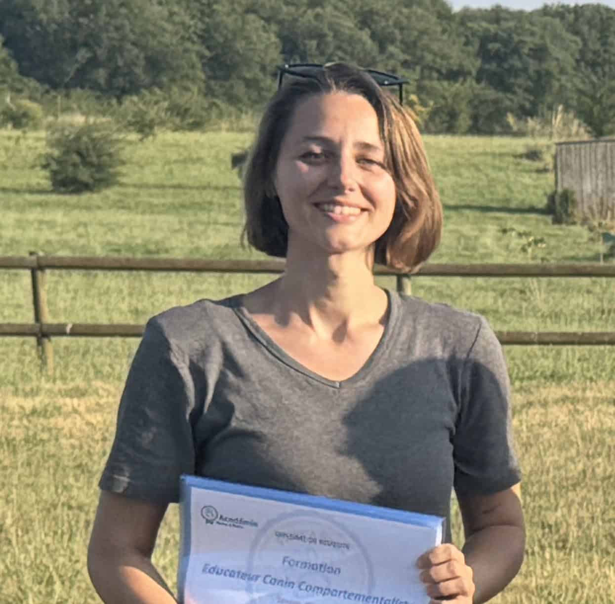 « J’ai passé une année merveilleuse avec Laurence, suis passée par tous les états émotionnels, et peux affirmer aujourd’hui que je ne suis plus la même personne. La théorie est solide, Laurence maîtrise son sujet, et la pratique est tellement enrichissante ! Nous avons vu un nombre fou de chiens, de binômes humain / canin, de professionnels concernés par ces deux mondes, et de situations différentes. Je repars avec plus de questions que de certitudes, contrairement à mon arrivée… Et c’est bon signe ! Car ici, pas de méthode toute faite, non ! On s’adapte au chien, à son foyer, à son mode de vie… Impossible de s’ennuyer