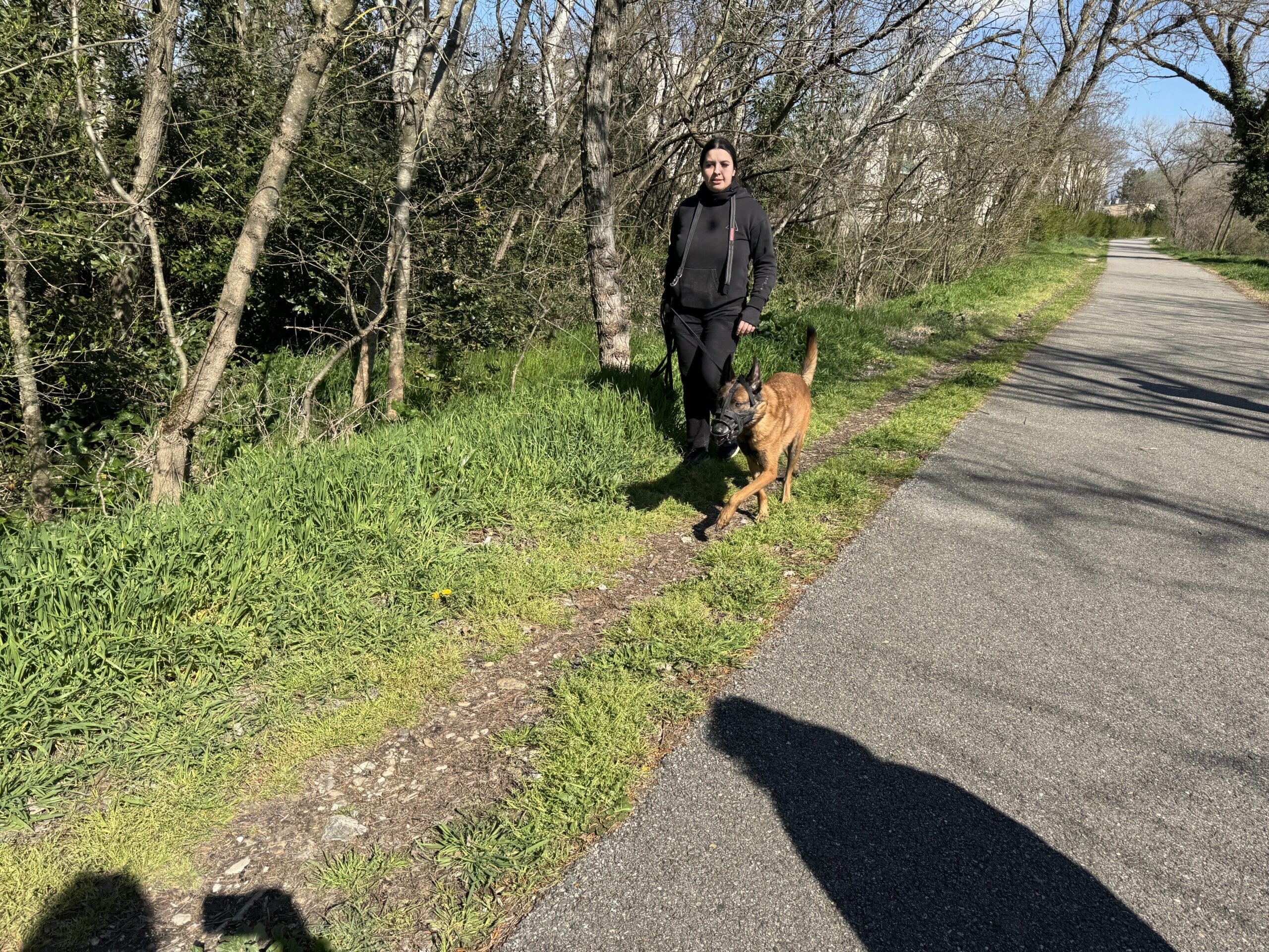 Mardi matin, changement de décor, et de level !!! La séance se fait sur la Voie Verte. Cette fois, on sait qu’on va croiser beaucoup d’humains, vélos, chiens, poussettes, absolument tout ce qui met Texas très en colère. Vic est très stressée, c’est un véritable défi pour elle aussi. Avec l’aide de Laeticia, élève de l’Académie pour devenir éducateur canin, on va s’attacher à la détendre, la faire rire, la faire chanter pour maitriser sa respiration et dédramatiser ( merci beaucoup, j’ai toujours encore la chanson en tête ! ). Il est primordial que Vic ne communique pas son stress à son chien, et qu’au contraire, elle puisse avoir un effet sécurisant et apaisant, afin de pouvoir coréguler des émotions positives. C’est un résumé rapide, mais si je me mets à vous expliquer ça, ce n’est plus un article, mais un livre que je vais écrire !