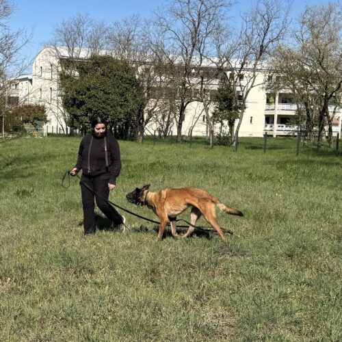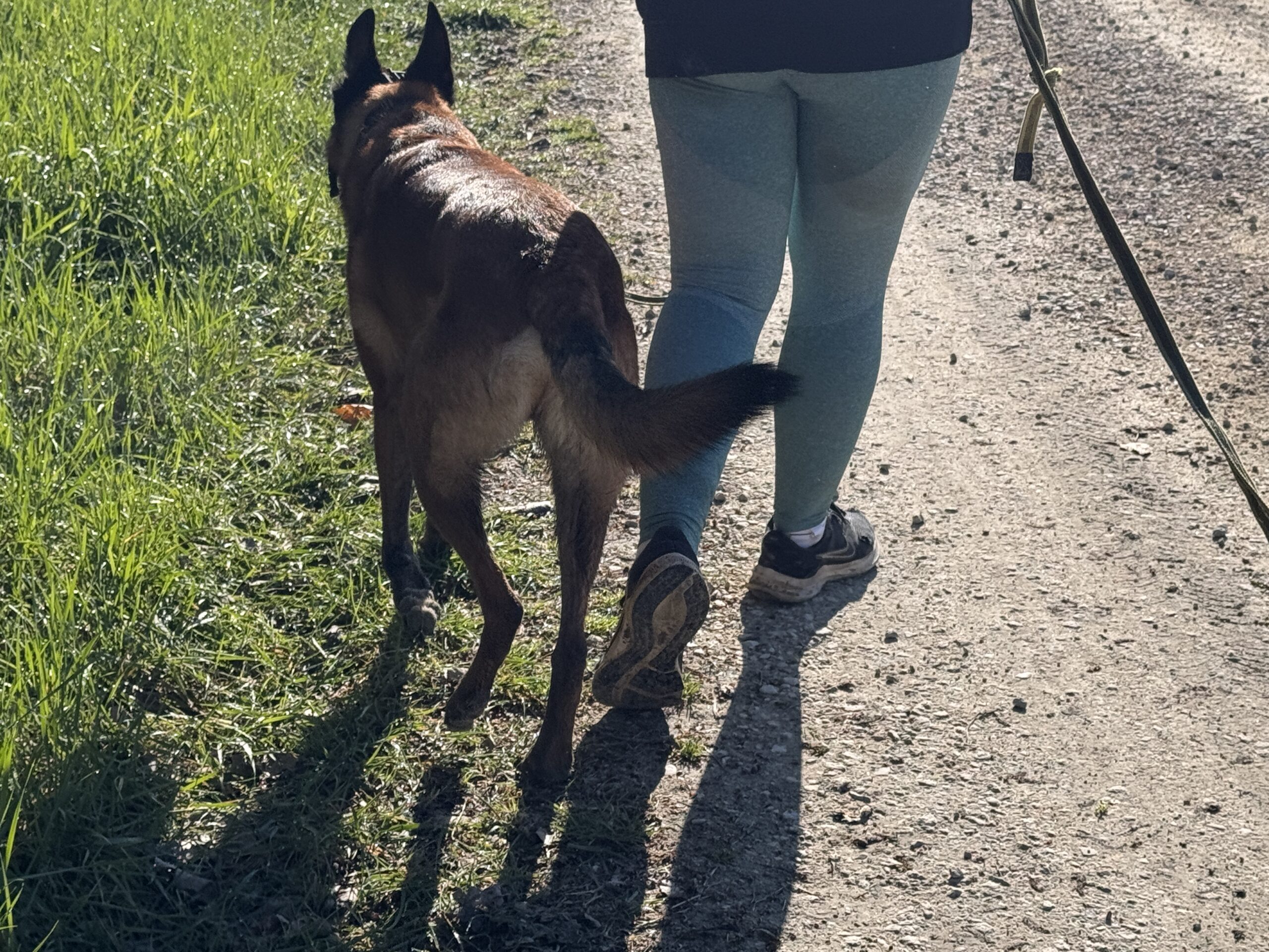 Bien sûr, rien n’est parfait, les mouvements sur la laisse sont loin d’être souples et détendus, le timing n’est pas toujours bon, le chien n’est pas toujours confortable, mais c’est déjà énorme ! C’est la toute première fois qu’ils peuvent se promener dans un lieu pareil, sans avoir un fauve à la verticale, éructant de rage …