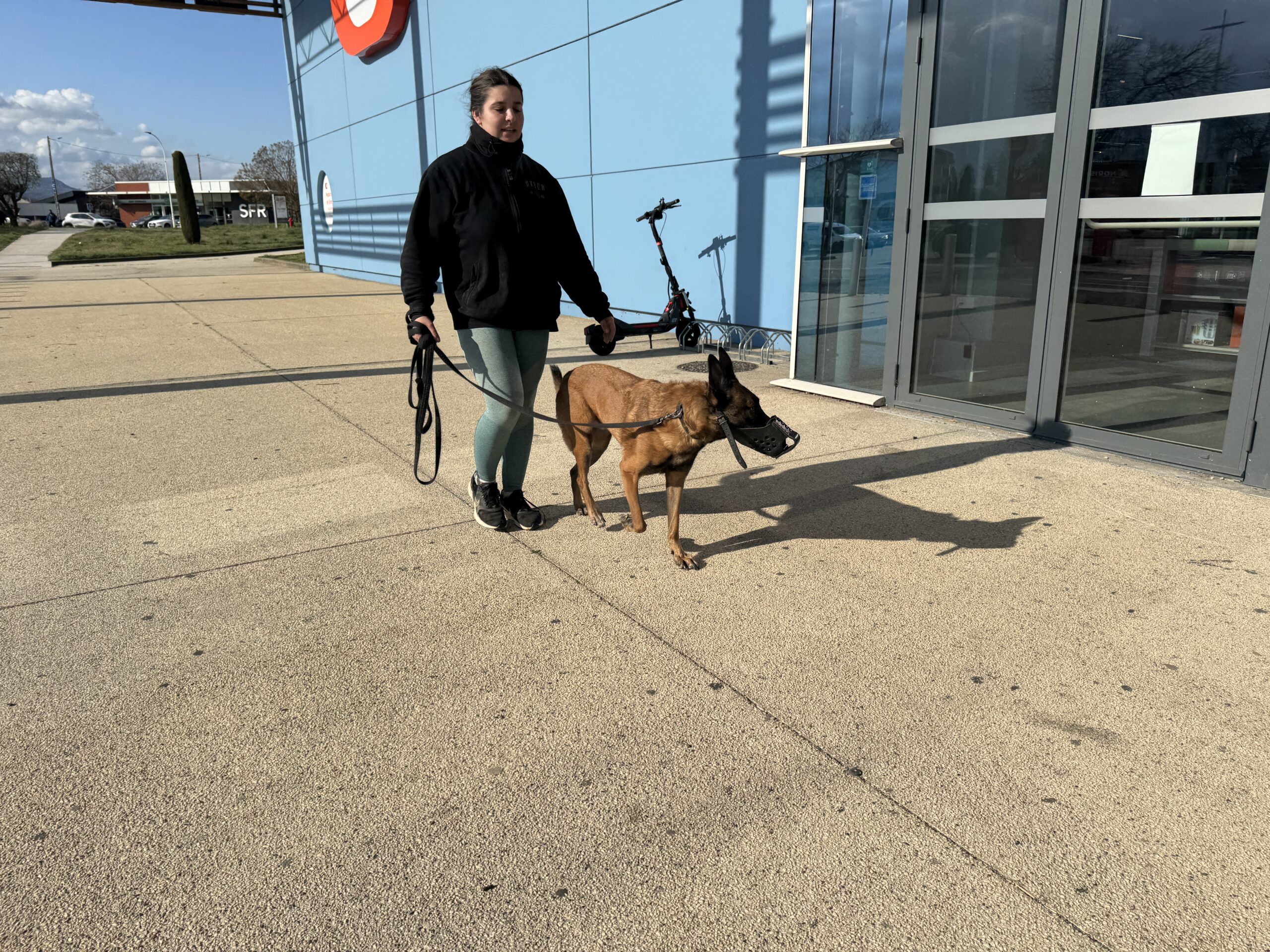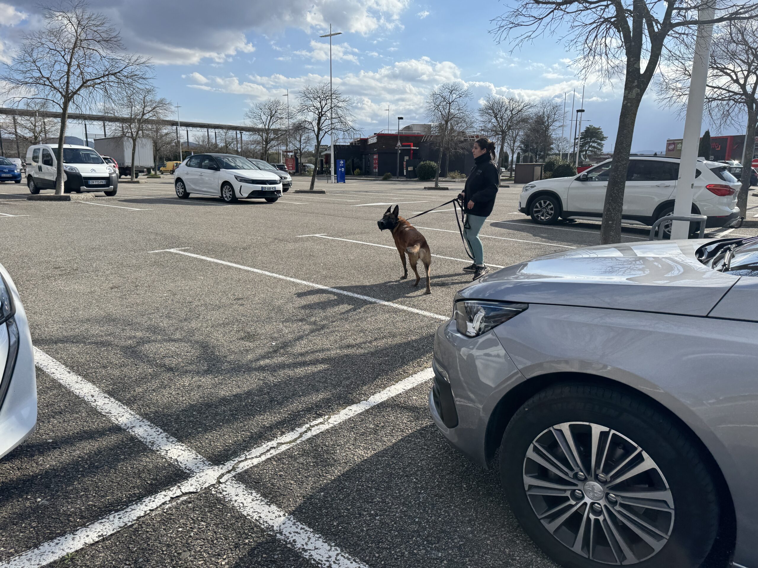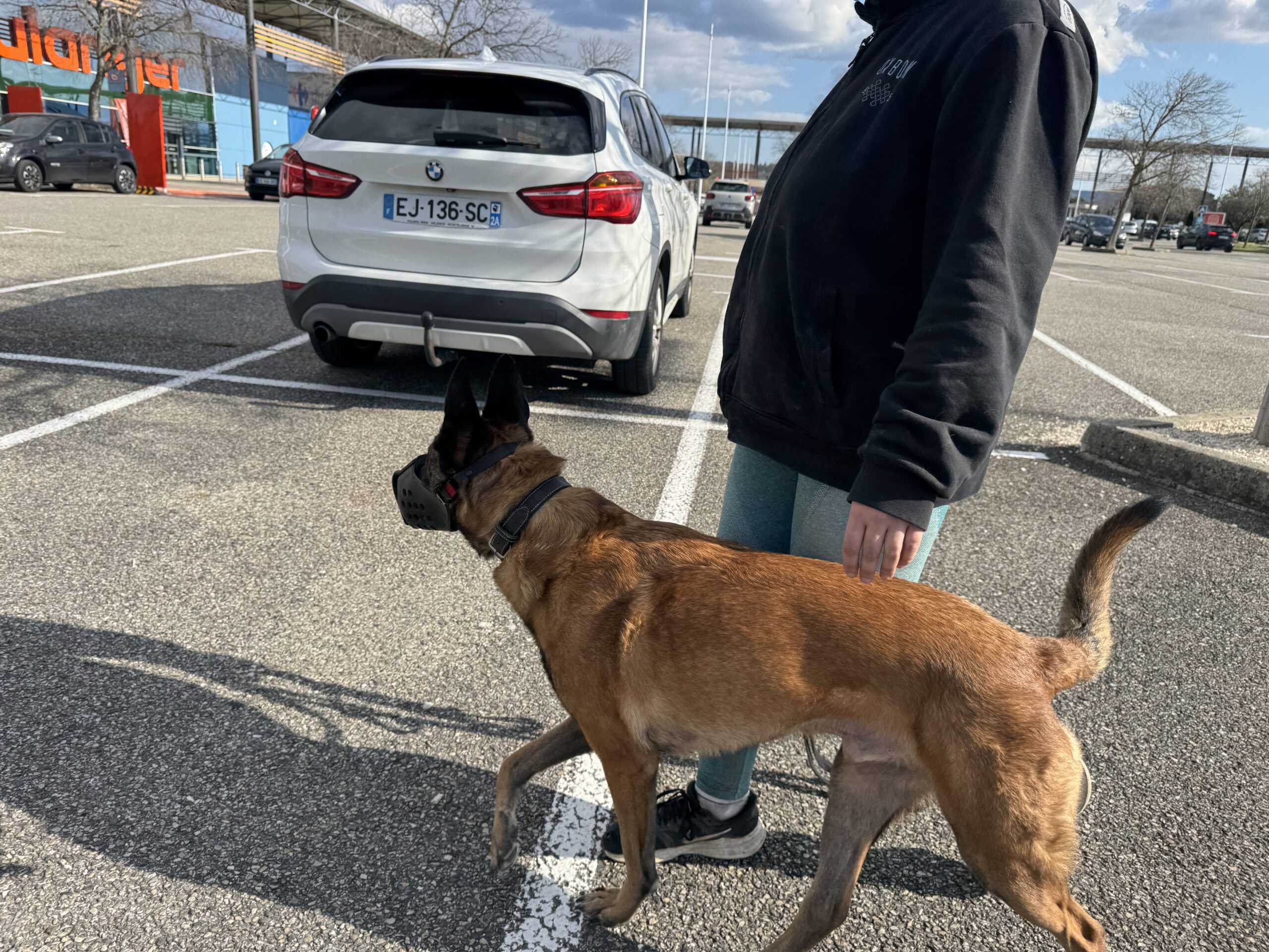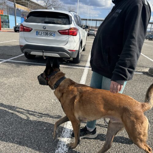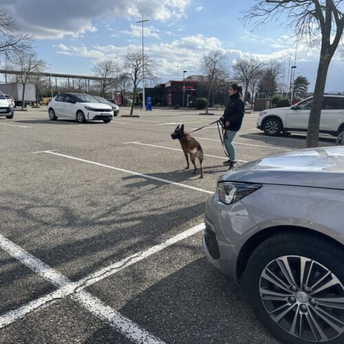 Repos tout la journée et en fin d’après-midi, rendez-vous dans les conditions les plus proches possibles du travail du binôme : un parking de centre commercial, avec la muselière de frappe. L’effet est immédiat, Texas est tendu, les yeux en mydriase, en vigilance constante. On commence par l’emmener sur un coin d’herbe, un peu à l’écart, et bonne nouvelle, il arrive à se détendre, à se concentrer dans les odeurs, à ne plus réagir au moindre bruit. On lui laisse tout le temps nécessaire, avant de reprendre des exercices de marche en laisse souple, comme on fait depuis la veille. On va alterner quelques toutes petites secondes face aux gens ou aux voitures, avec des respirations dans des coins plus calmes.