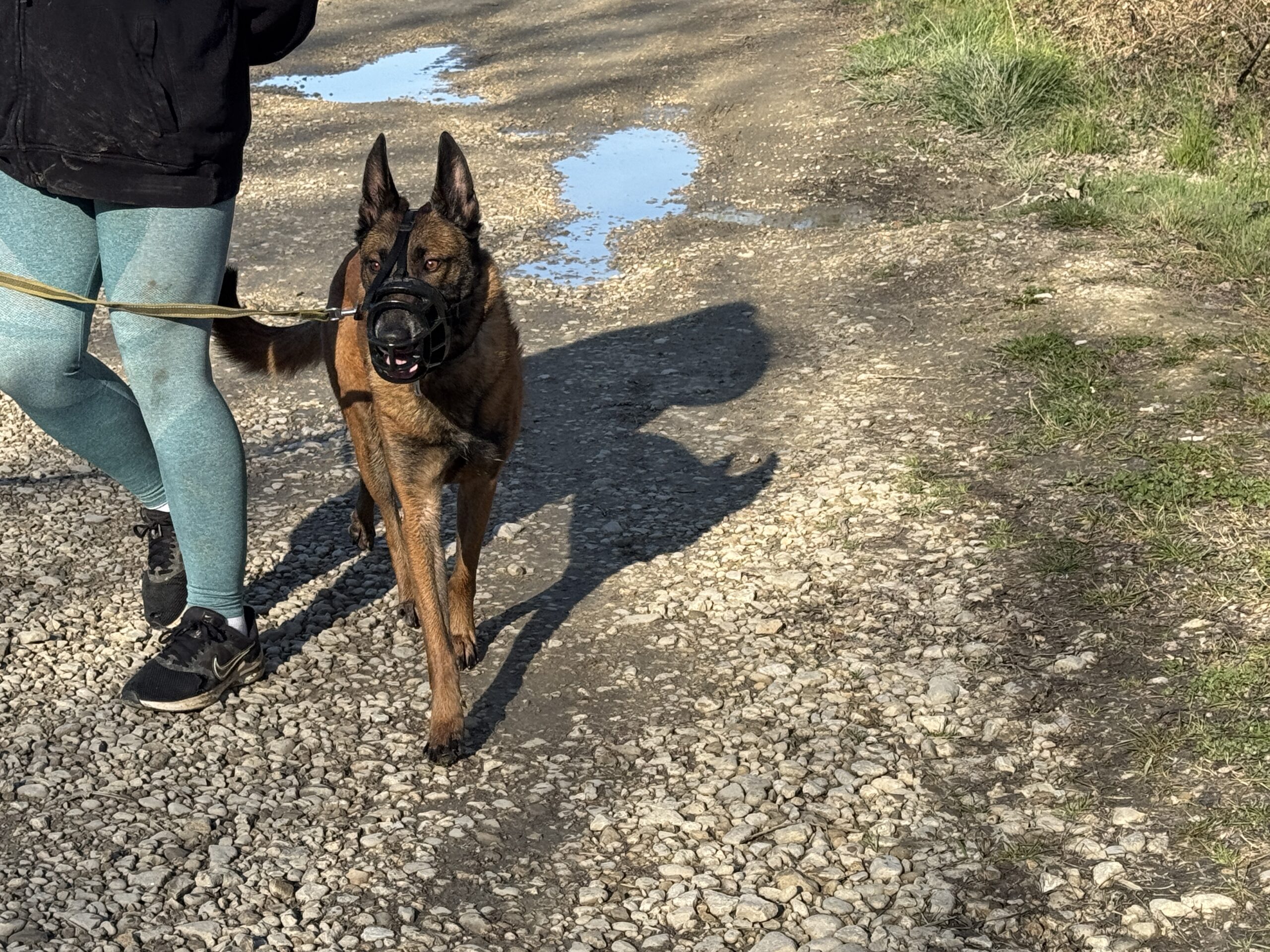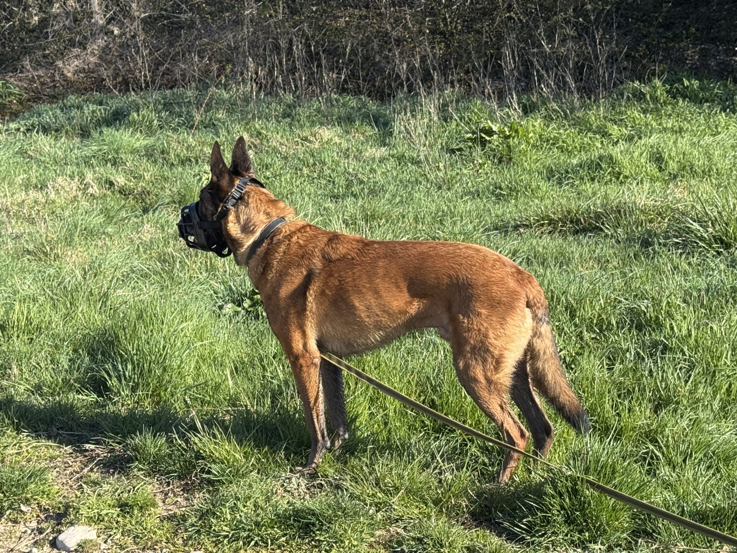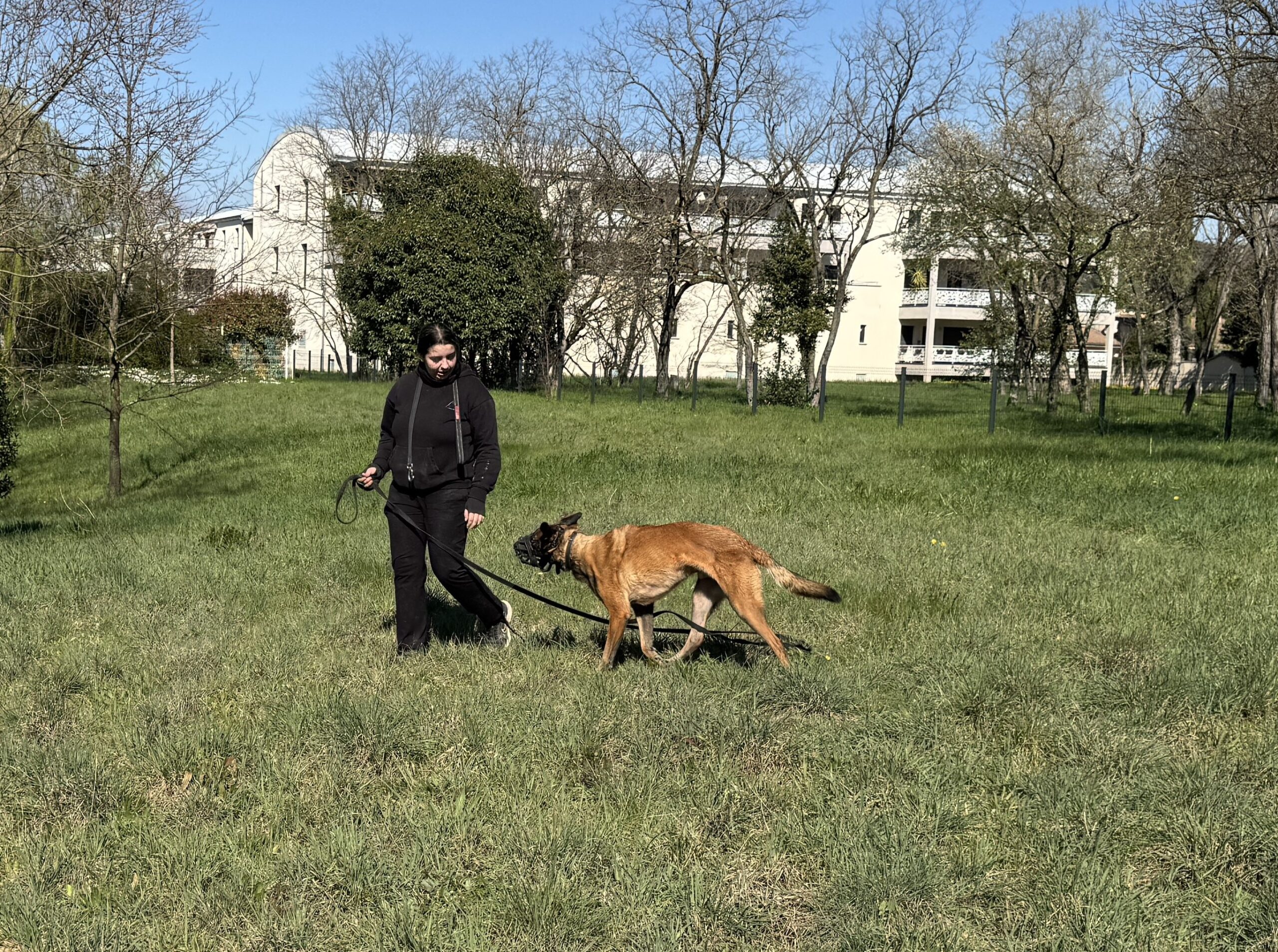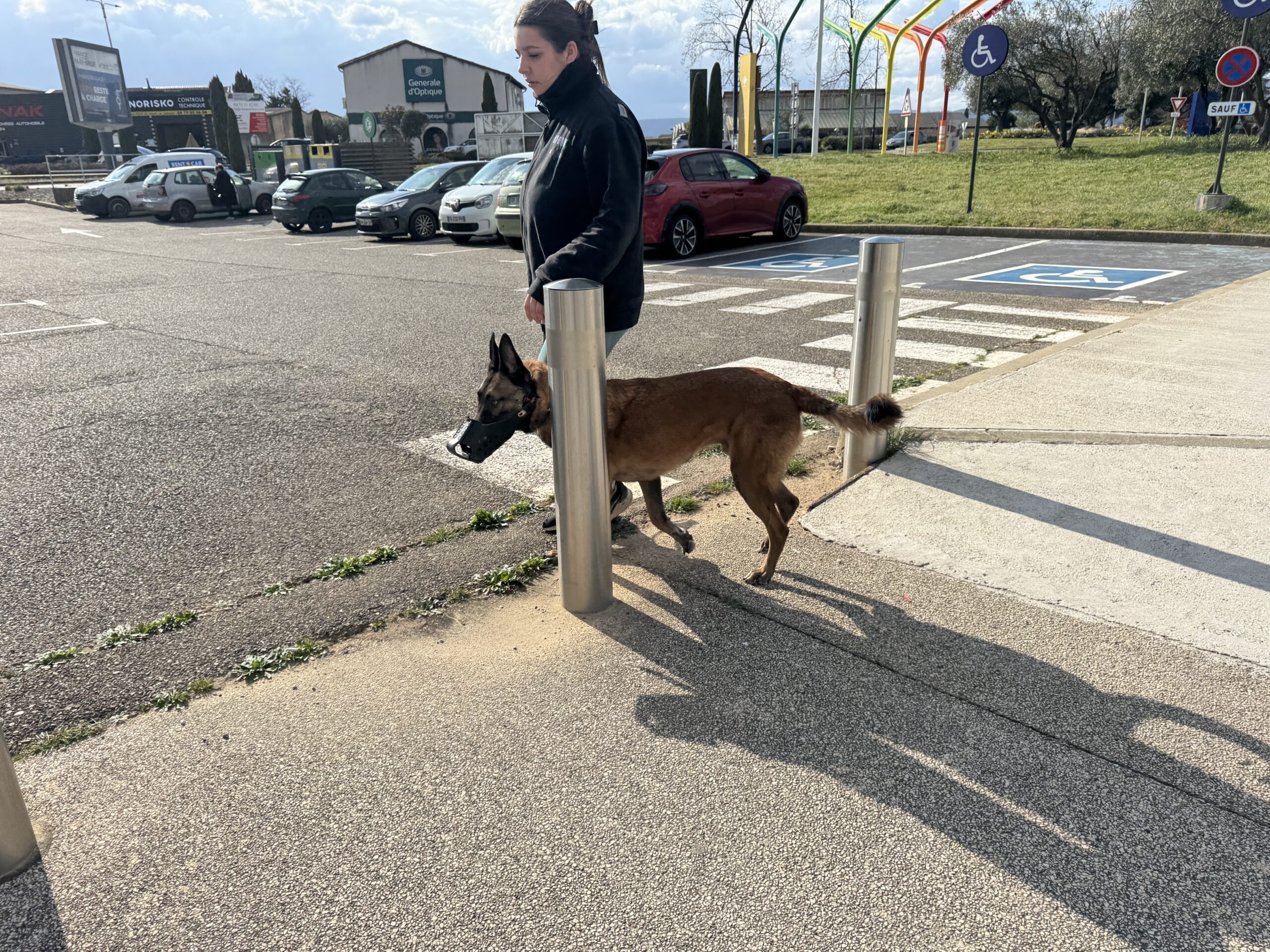 Repos tout la journée et en fin d’après-midi, rendez-vous dans les conditions les plus proches possibles du travail du binôme : un parking de centre commercial, avec la muselière de frappe. L’effet est immédiat, Texas est tendu, les yeux en mydriase, en vigilance constante. On commence par l’emmener sur un coin d’herbe, un peu à l’écart, et bonne nouvelle, il arrive à se détendre, à se concentrer dans les odeurs, à ne plus réagir au moindre bruit. On lui laisse tout le temps nécessaire, avant de reprendre des exercices de marche en laisse souple, comme on fait depuis la veille. On va alterner quelques toutes petites secondes face aux gens ou aux voitures, avec des respirations dans des coins plus calmes.