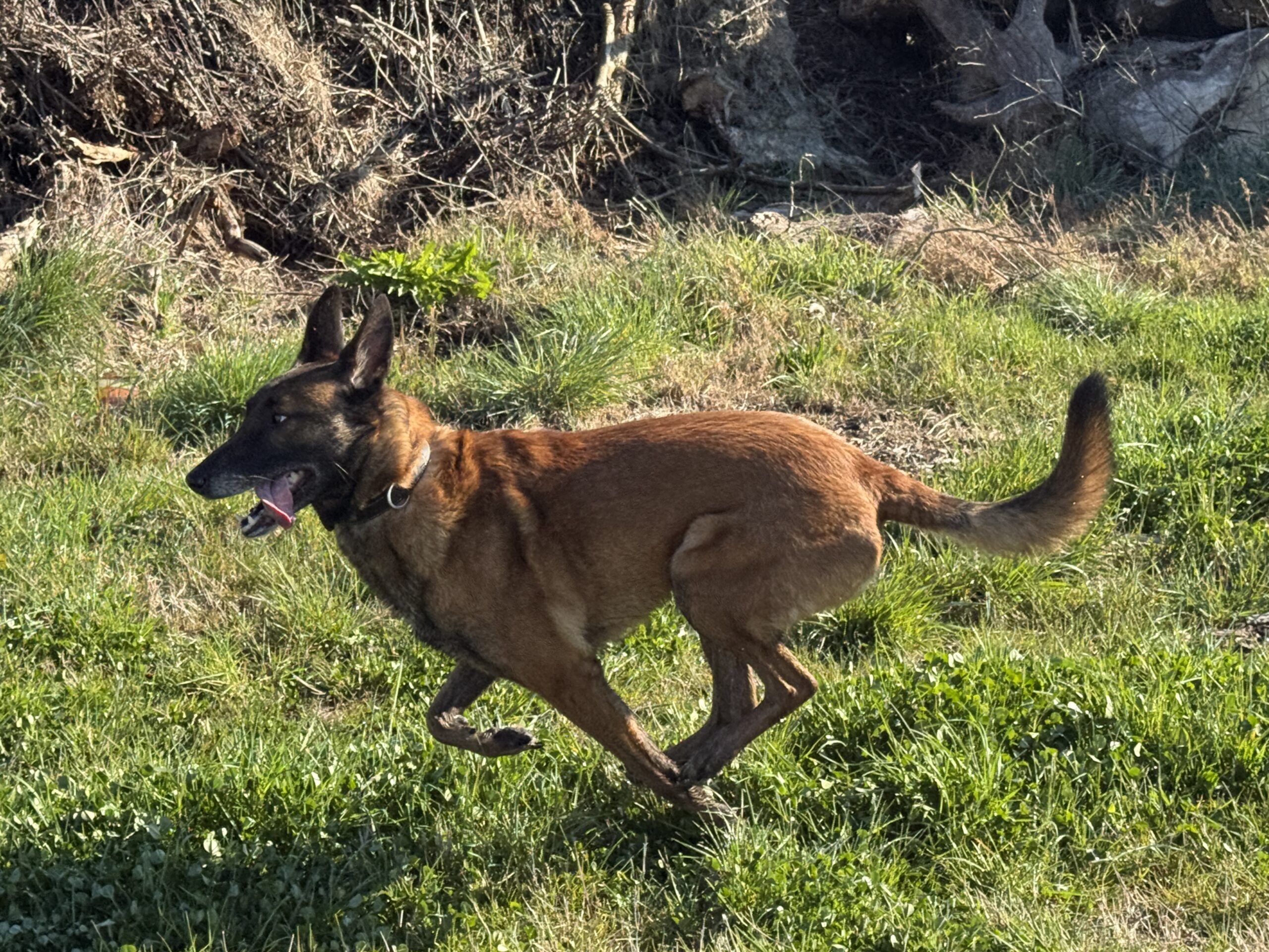 L’après -midi, on part en milieu ouvert. On peut potentiellement croiser des gens, mais on les voit de très loin, ce qui permet l’anticipation. On alterne les moments avec et sans muselière, avec et sans longe, avec rappel ou rappel silencieux. Bref, on commence à déconditionner tous les gestes qui mettent Texas en vigilance par anticipation ( si on me rapelle, si j’ai la muselière, c’est qu’il va y avoir un danger, donc je vais devoir attaquer …)