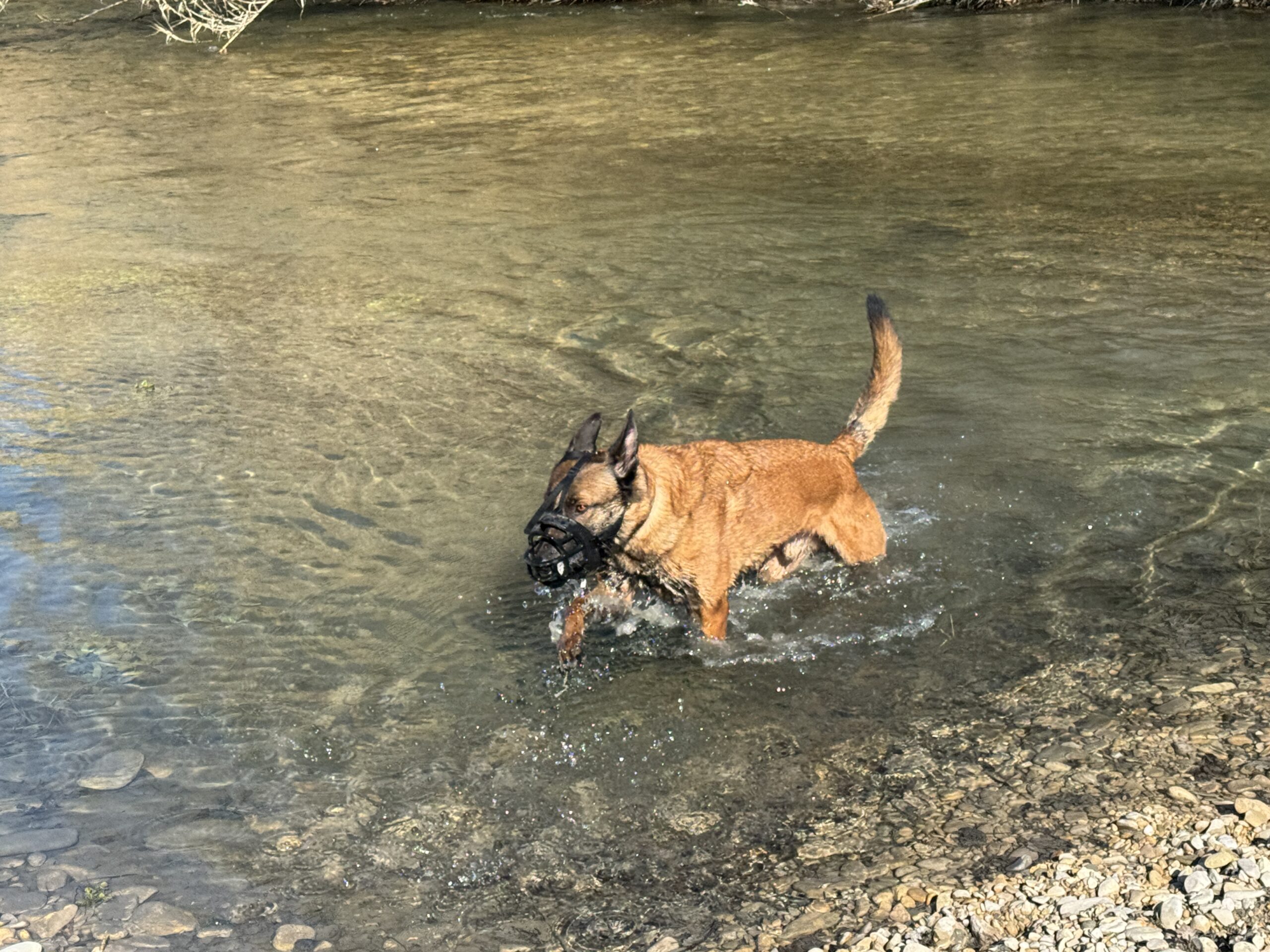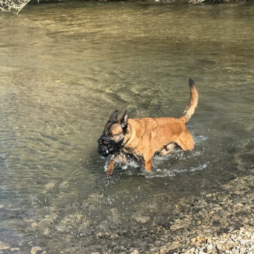 Vic n’en revient pas, elle ne l’a jamais vu comme ça. Il ne réagit absolument pas sur les voitures ou les caddies, il s’écarte simplement. Il est en vigilance sur les humains isolés mais se détourne sans souci quand on lui demande. Ca reste compliqué si c’est un groupe d’hommes, normal, c’est son boulot, et c’est la première fois que je le vois en colère et qu’il décharge ( muselé) sur le bras de Vic. J’imagine les dégâts sans… Par contre, il arrive à redescendre en émotion rapidement, encore une sacrée nouveauté !